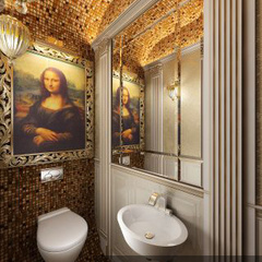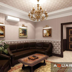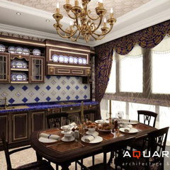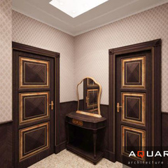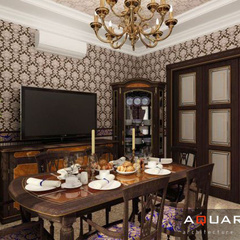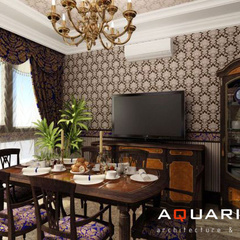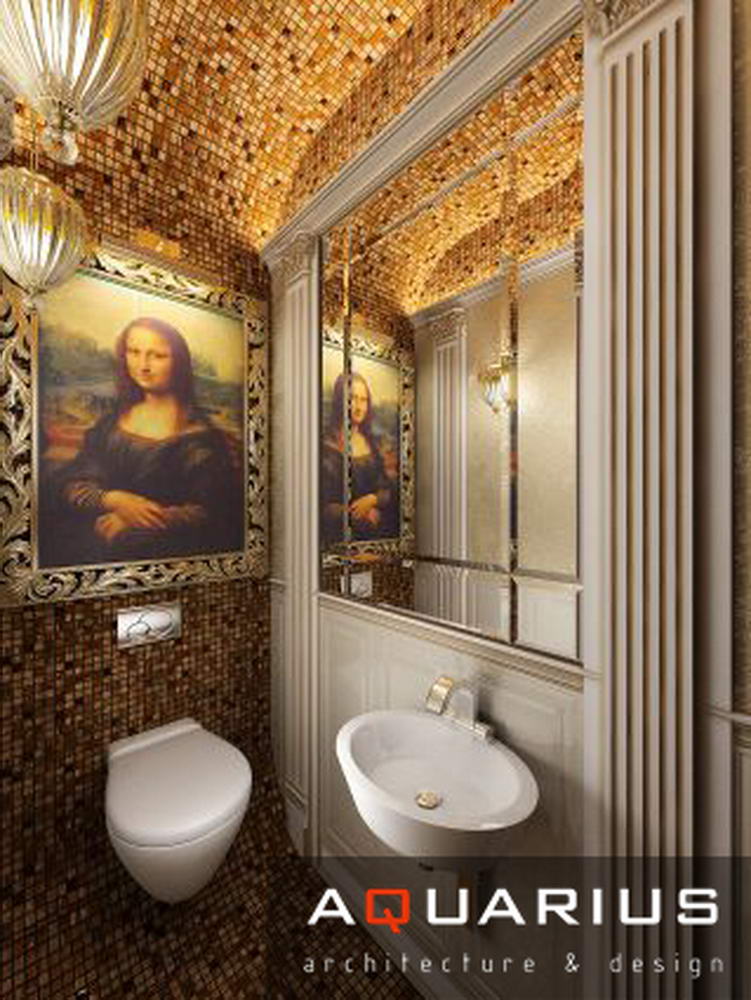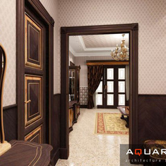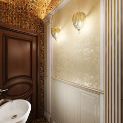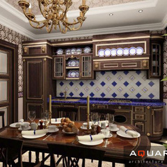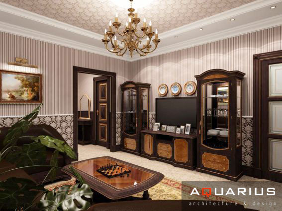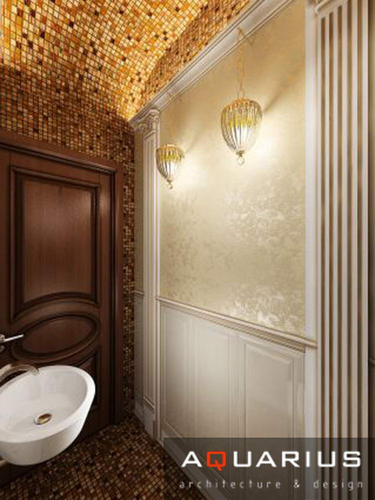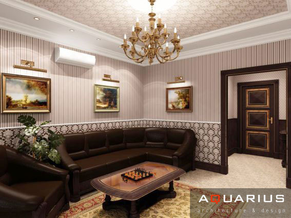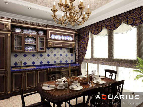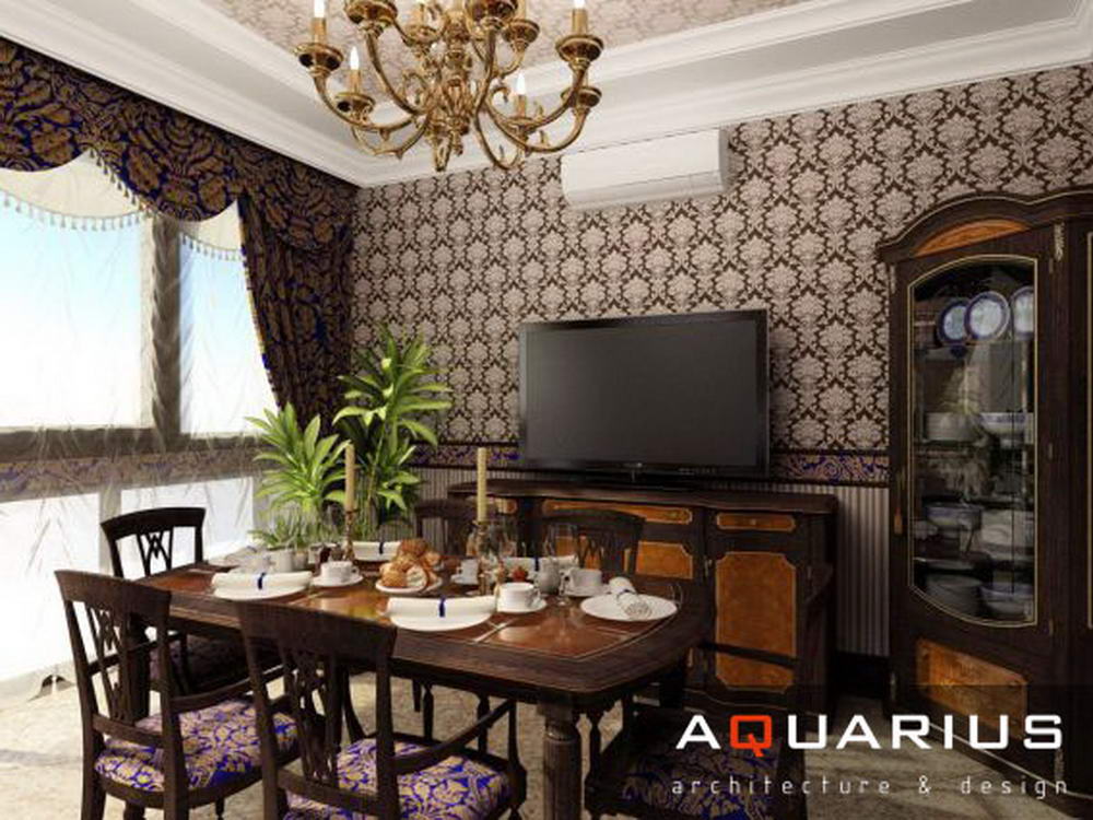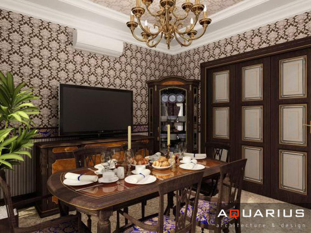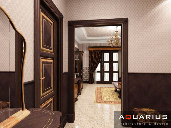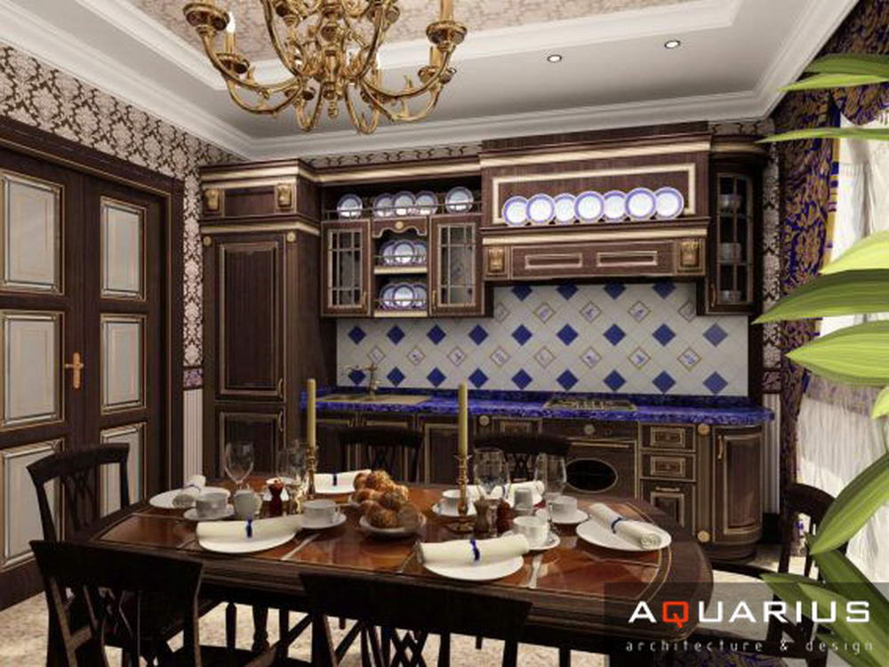 Дизайн двухэтажного дома в поселке Янтарный выполнен в классическом стиле. Строгая мебель темного дерева прекрасно гармонирует с другими элементами отделки и хорошо смотрится в просторных помещениях. Освещение выполнено с помощью подсветки и люстр в старинном стиле.