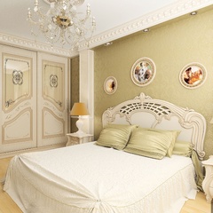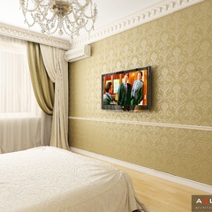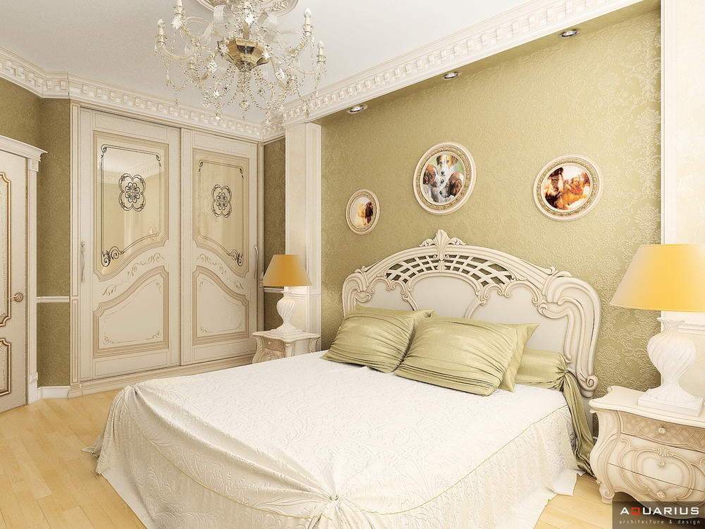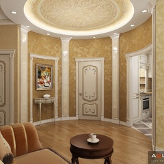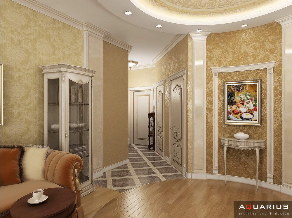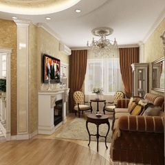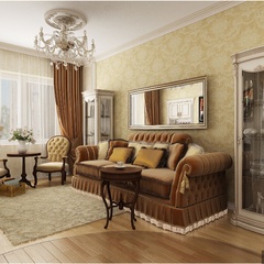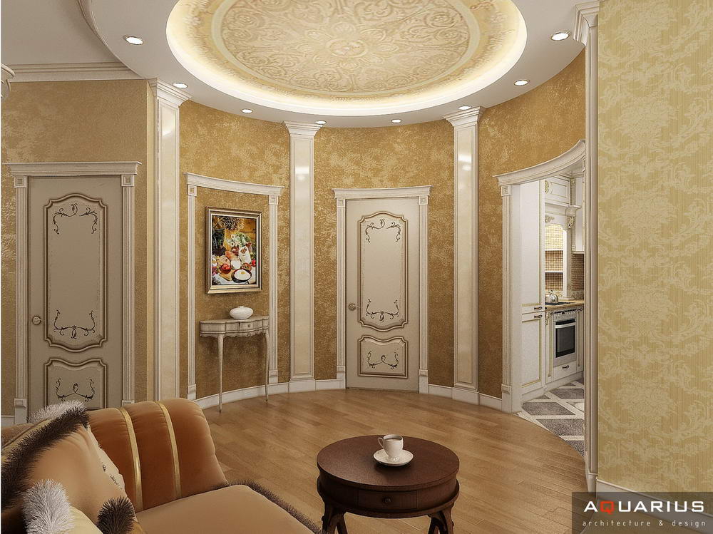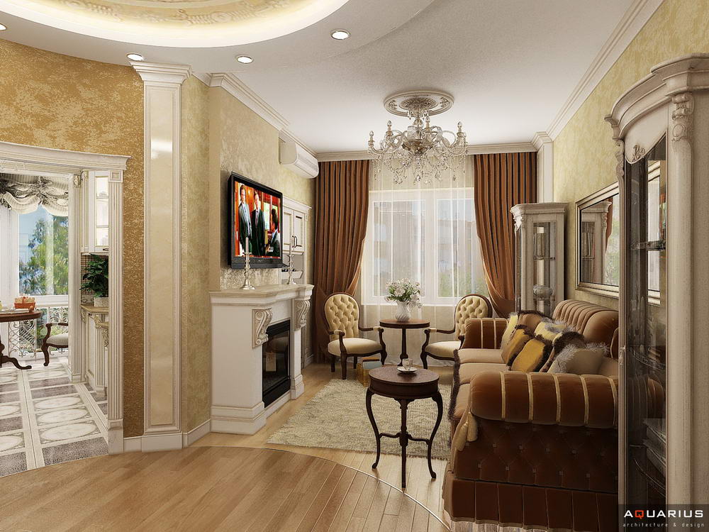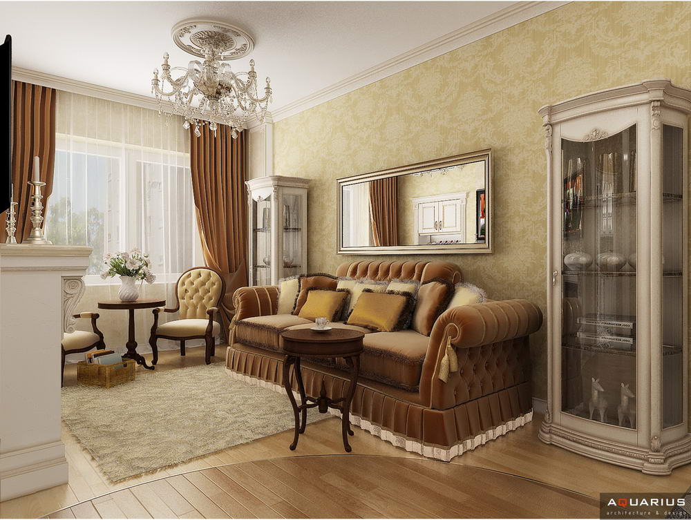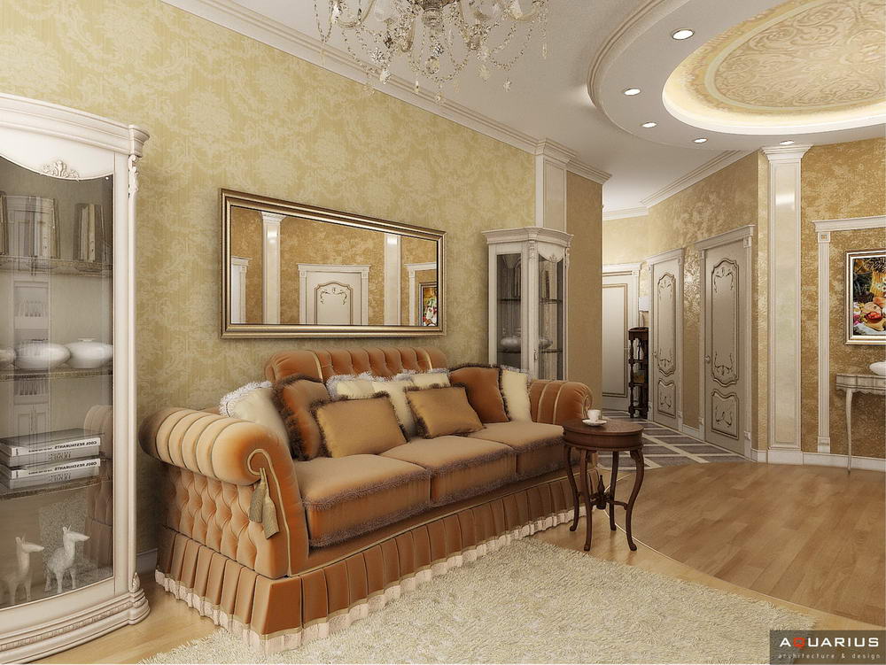 Красоту и роскошь классики не может заменить ни один стиль в интерьере. На 70 кв. метрах дизайнеры сумели воплотить роскошный классический интерьер в стиле барокко. Каждая деталь интерьера от обоев с растительным рисунком, до украшений подчеркивает изысканность выполненного дизайна. Украшением гостиной зоны выступает необычной формы альков, а так же камин классической формы.