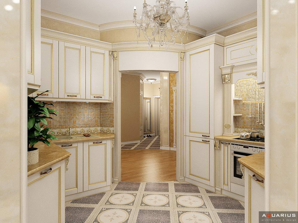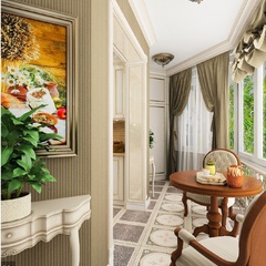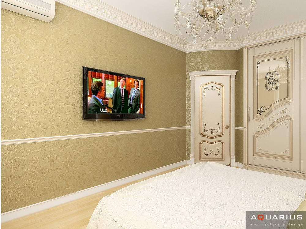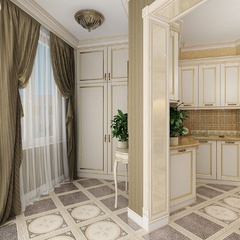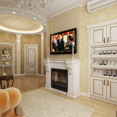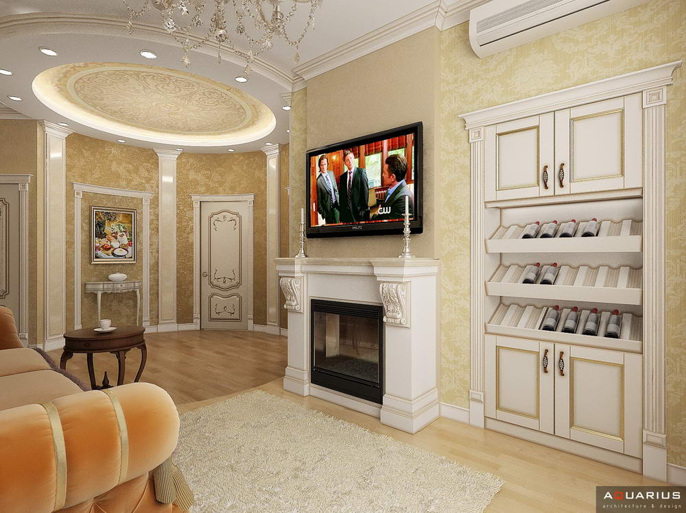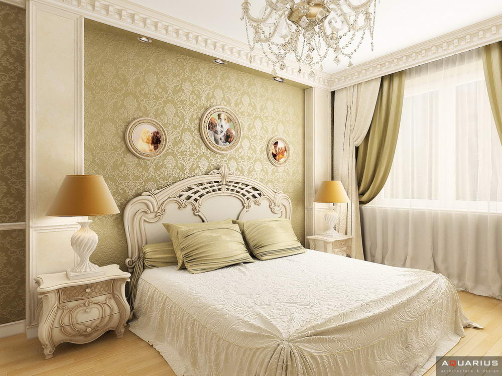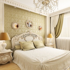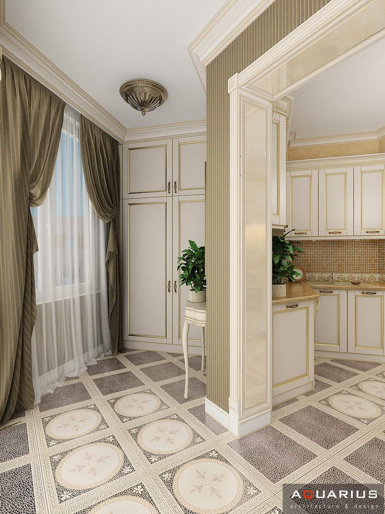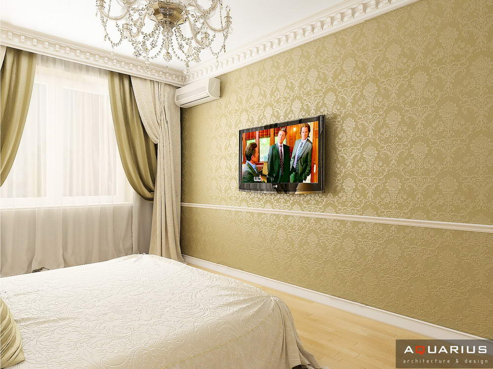 Красоту и роскошь классики не может заменить ни один стиль в интерьере. На 70 кв. метрах дизайнеры сумели воплотить роскошный классический интерьер в стиле барокко. Каждая деталь интерьера от обоев с растительным рисунком, до украшений подчеркивает изысканность выполненного дизайна. Украшением гостиной зоны выступает необычной формы альков, а так же камин классической формы.