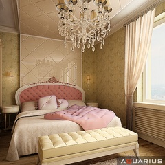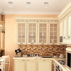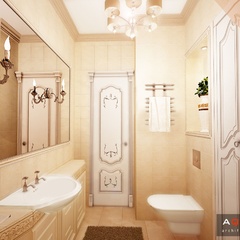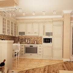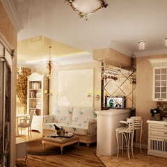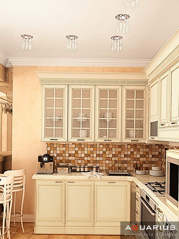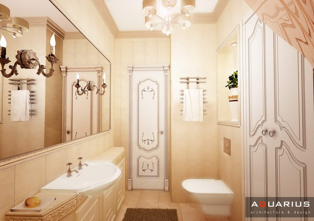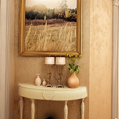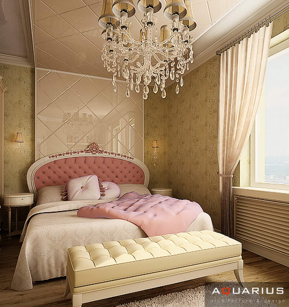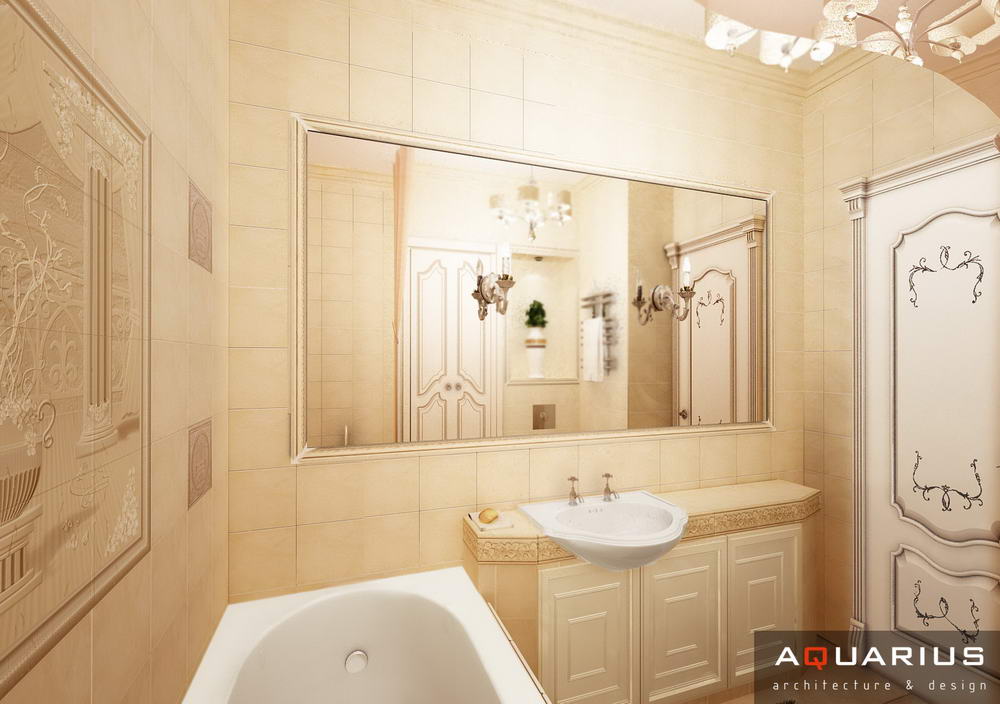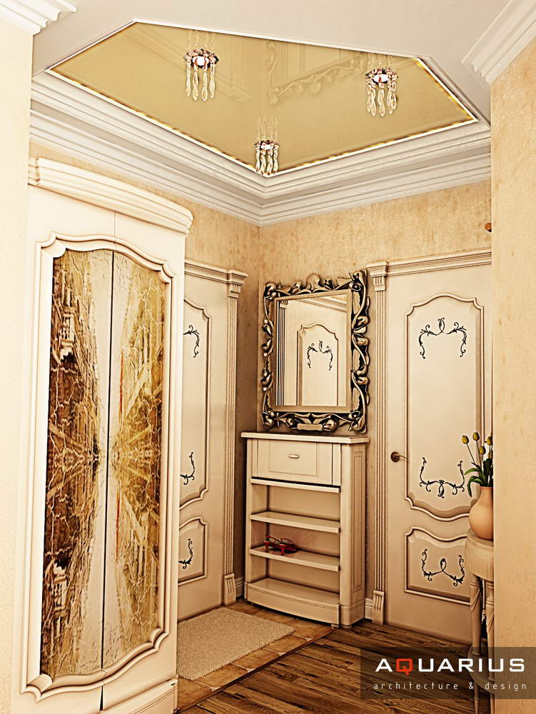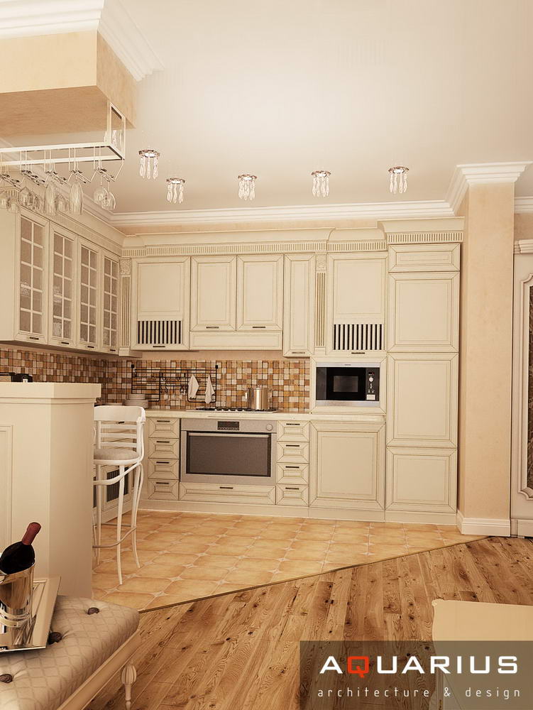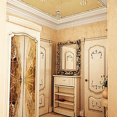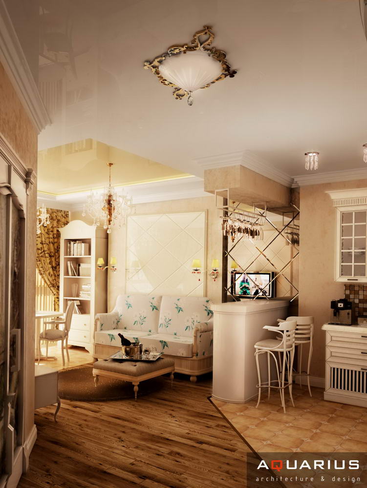 Классический интерьер этой квартиры выполнен в пастельных тонах, с использованием большого количества аксессуаров для украшения. Это и мебель классической формы, и картины, и хрустальные люстры. Текстиль также играет важную роль в оформлении данного интерьера.