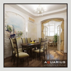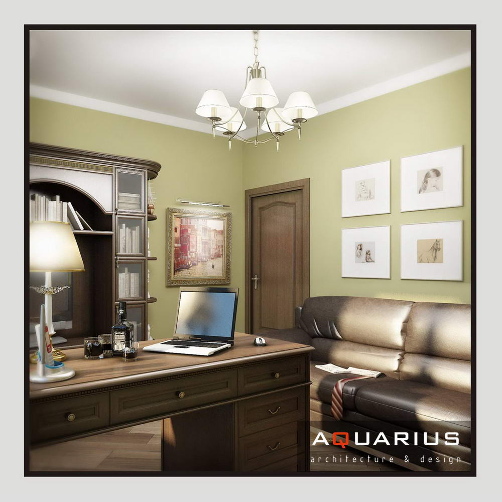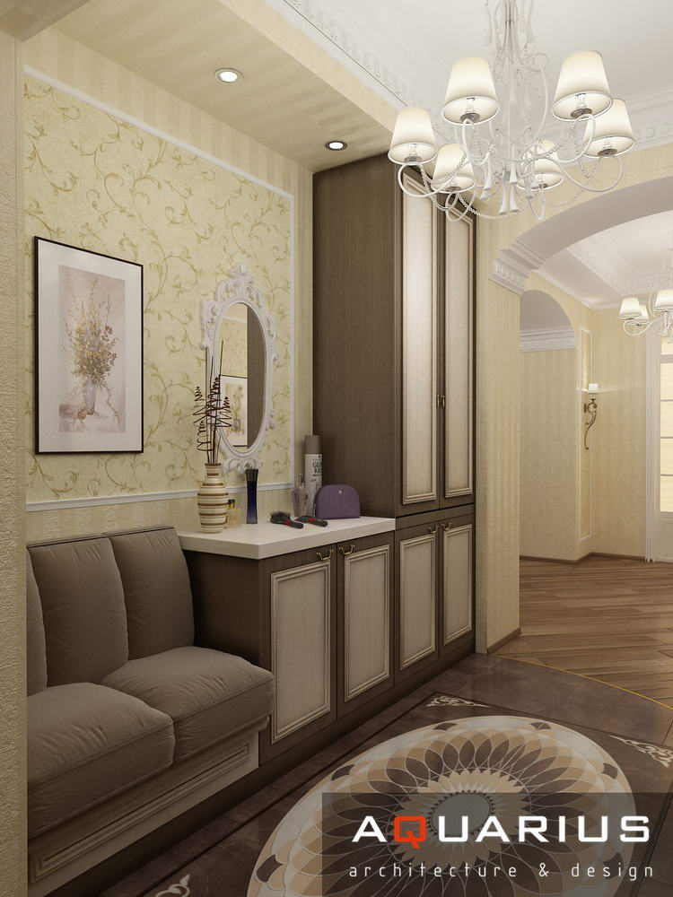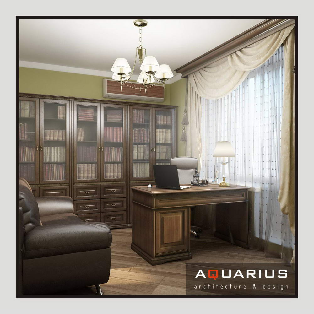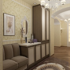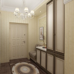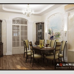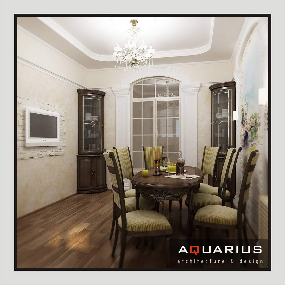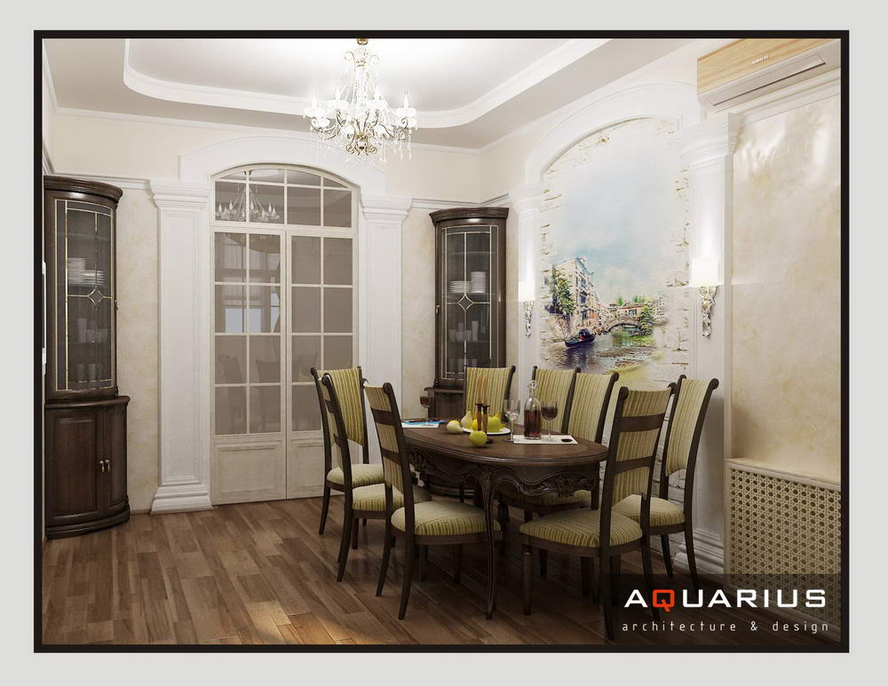 Дизайн для этой квартиры был выбран в классическом стиле. Столовая оформлена высокими шкафами для посуды, а также большим столом и темного дерева и мягкими стульями. В гостиной устроен камин, а большой мягкий диван дополняет атмосферу уюта и комфорта. Кабинет с классическими шкафами для книг и массивным столом, спальня с классической резной мебелью – все говорит о хорошем вкусе хозяев дома.