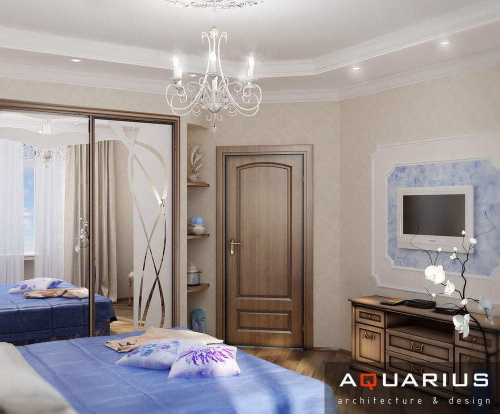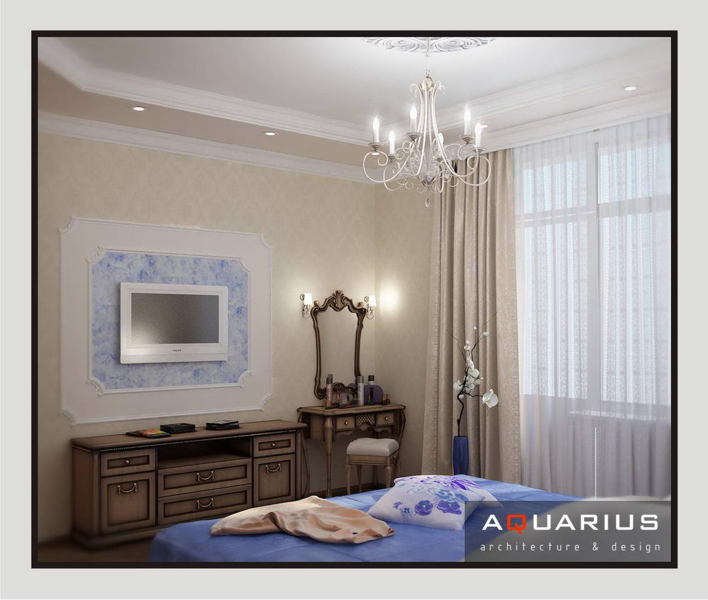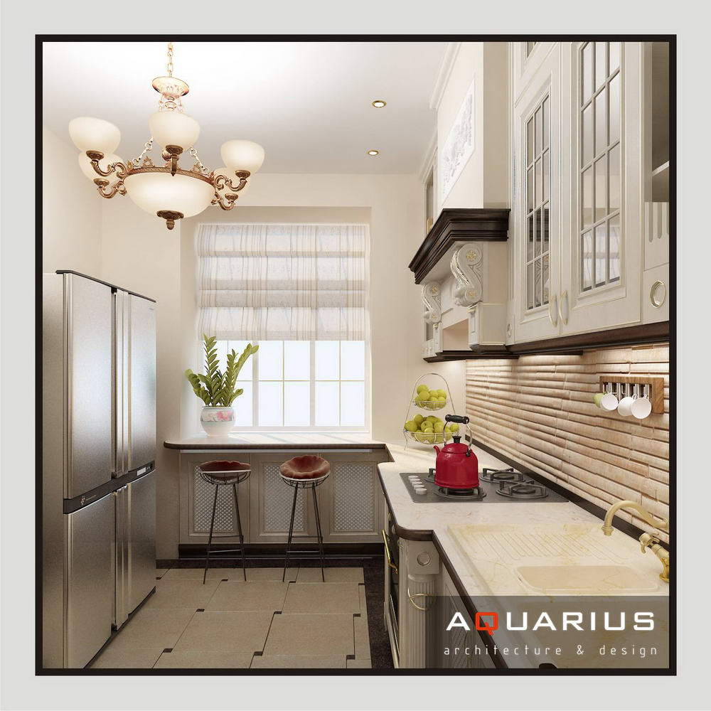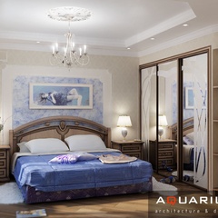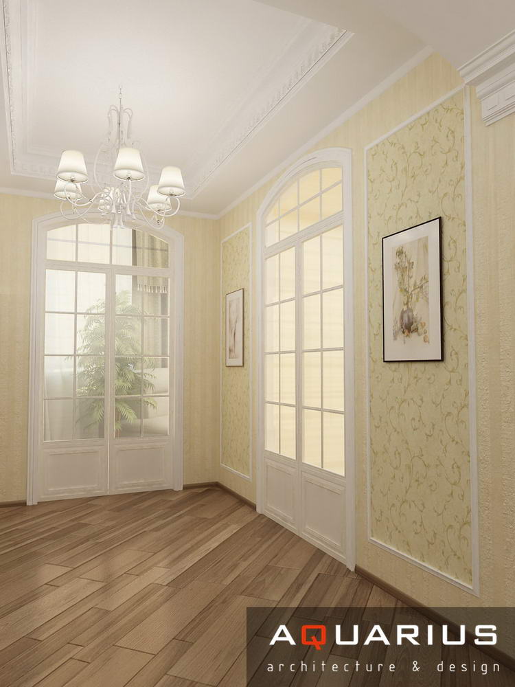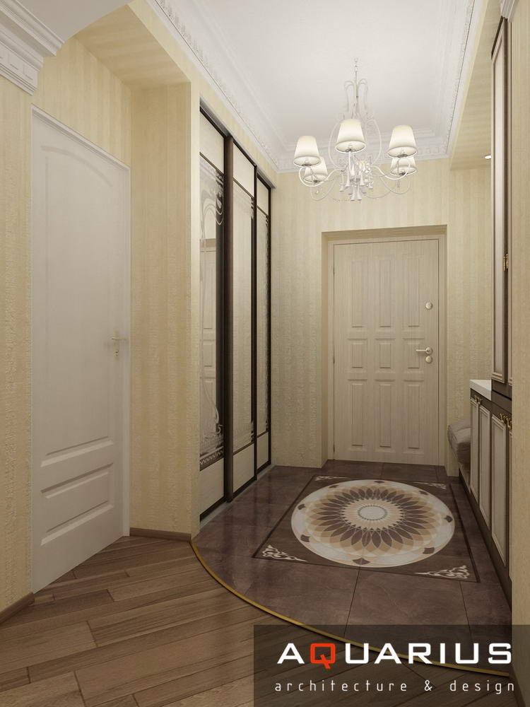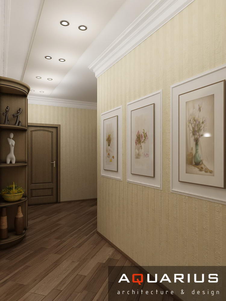Дизайн для этой квартиры был выбран в классическом стиле. Столовая оформлена высокими шкафами для посуды, а также большим столом и темного дерева и мягкими стульями. В гостиной устроен камин, а большой мягкий диван дополняет атмосферу уюта и комфорта. Кабинет с классическими шкафами для книг и массивным столом, спальня с классической резной мебелью – все говорит о хорошем вкусе хозяев дома.