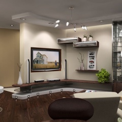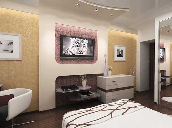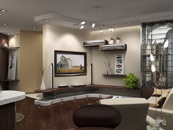 Дизайн трехкомнатной квартиры по улице Красноармейской в Ростове-на-Дону выполнен в современном стиле. Изгибы потолочных форм плавно перетекают на стены, где подчеркиваются цветом. В отделке помещений используются материалы с различными фактурами.