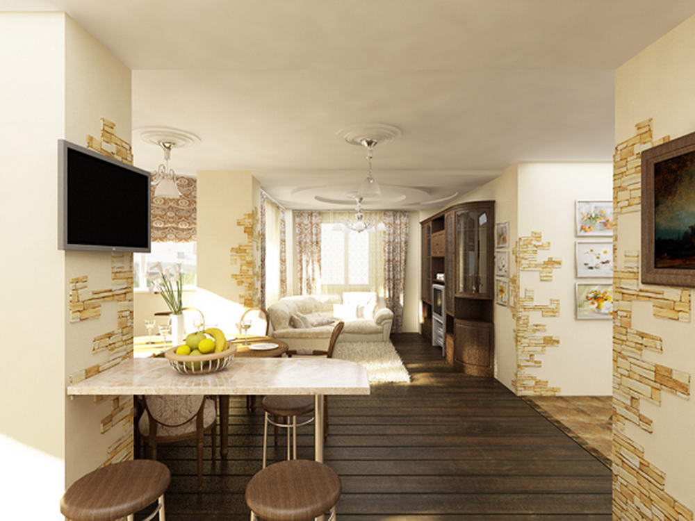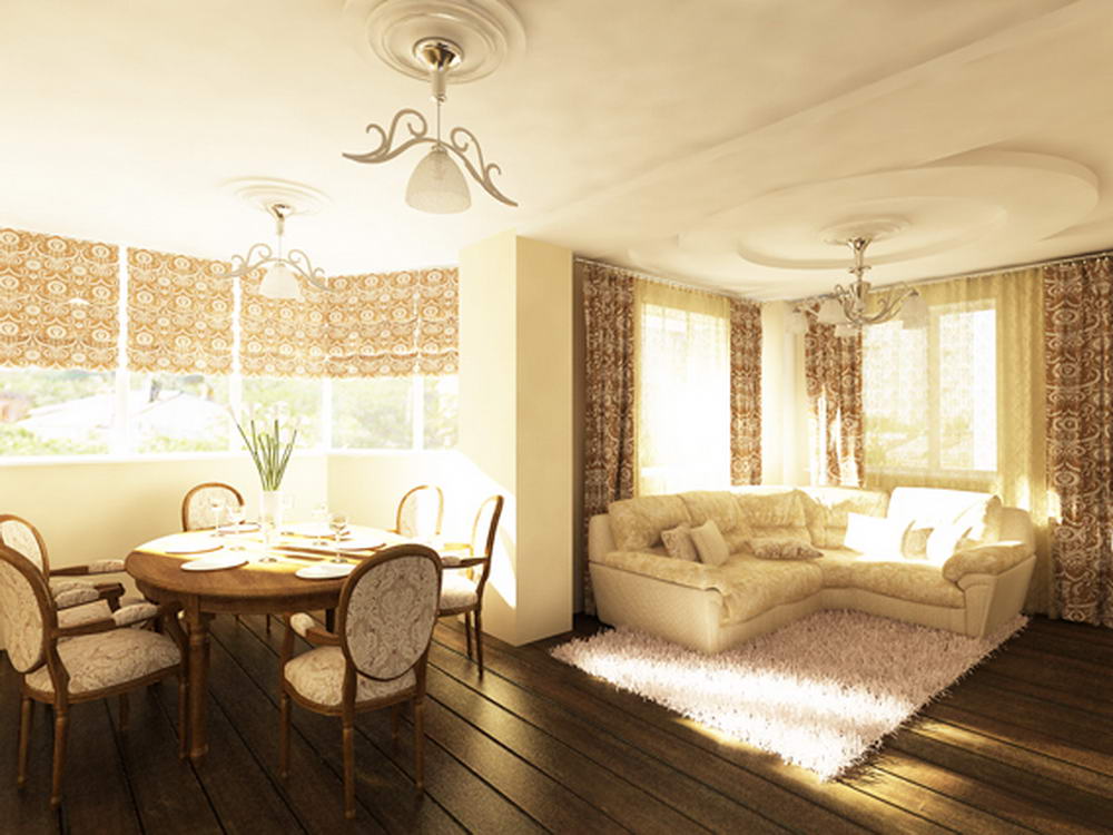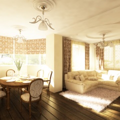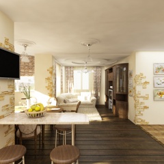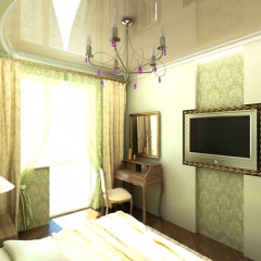 В интерьере этой квартиры были применены принципы смешения разных стилей для создания гармоничного дизайна помещения. Так в гостиной преобладает классический стиль, а спальня выполнена в современном стиле с использованием классических деталей. В кухне же можно угадать элементы средиземноморского стиля.