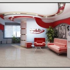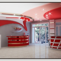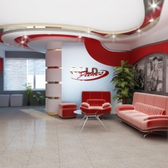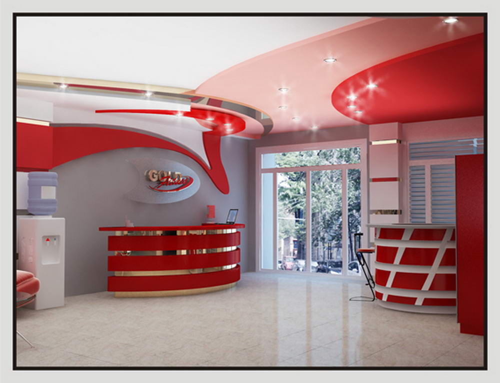 Интерьер выполнен в серо-голубых тонах, с яркими красно-розовыми акцентами. Отделка потолка в виде ярких полосок, с вставками из светильников придают помещению дополнительный объем и украшают его. Современная мебель дополняет необычную задумку дизайнеров интерьера.